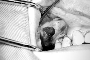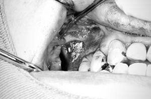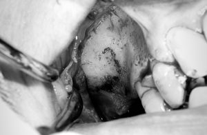 2.骨を削り、人工骨をいれる為の窓を開け、上顎洞粘膜(シュナイダー膜)を上顎洞から剥離する。