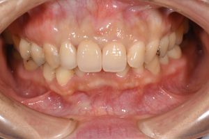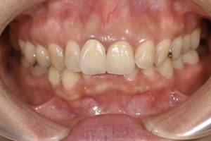 前歯2本がセラミックで治療されているが、右上1番にメタルの土台が使用されているため、歯茎が黒く見える、