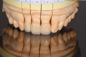 歯肉の下までしっかり型取りするために、圧排コードを用いてシリコン印象で製作したemaxクラウン。